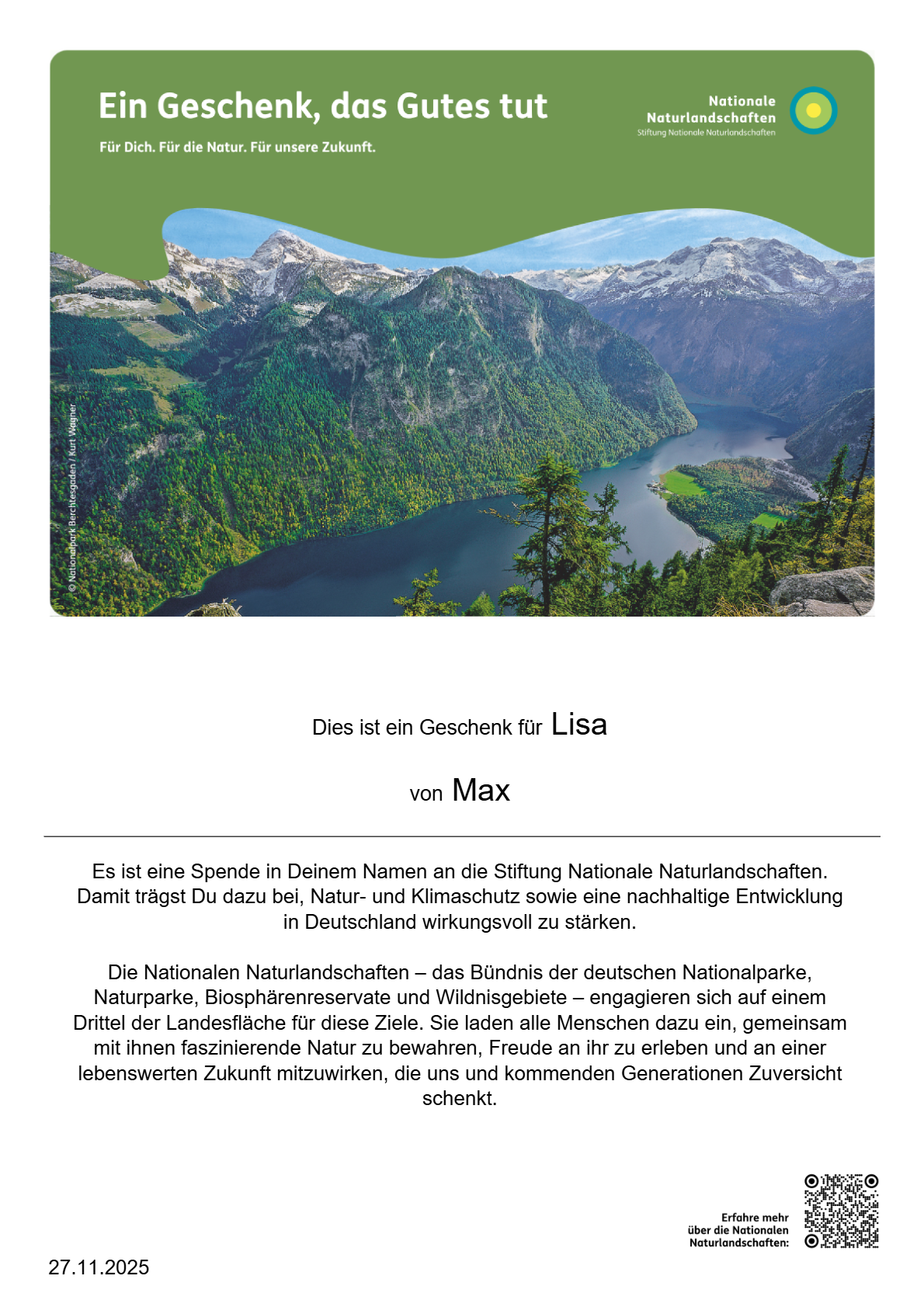 Deine Geschenkspende unterstützt im Namen der/des Beschenkten die Stiftung beim Schutz und der Entwicklung der Nationalen Naturlandschaften. Dieses Geschenk tut gleich mehrfach Gutes und schenkt drei ganz besondere Dinge: